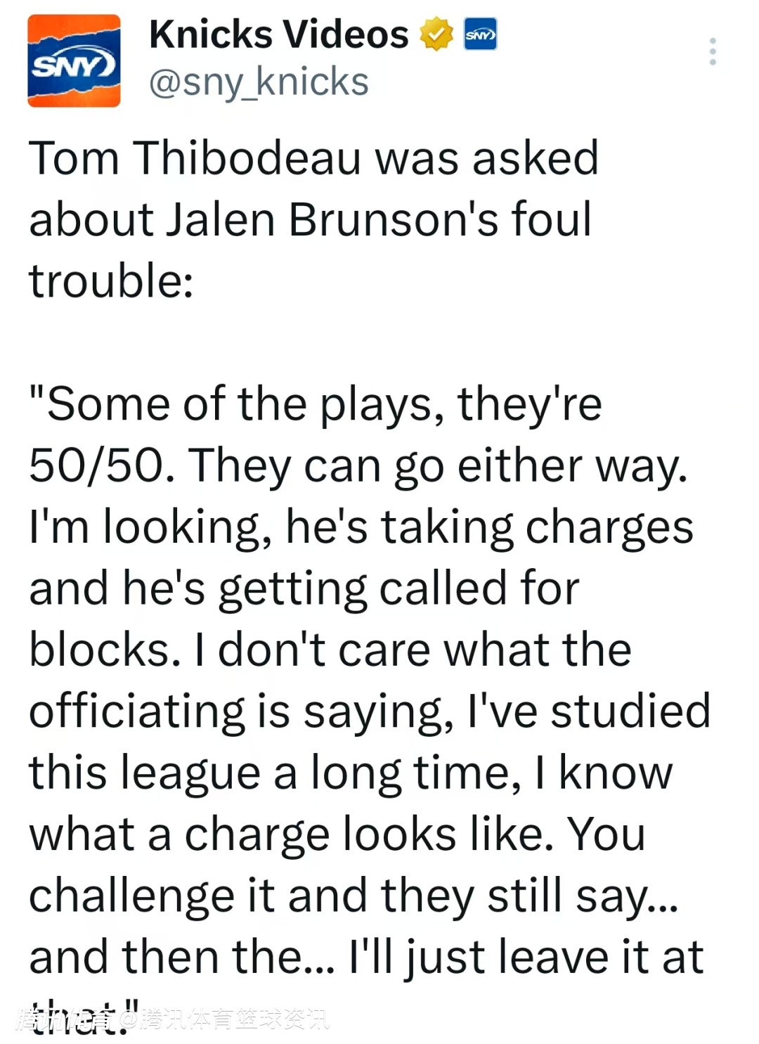 被问及布伦森的犯规麻烦时,锡伯杜说道:“有些判罚属于五五开的球,两种吹罚都有可能。我看他在造进攻犯规时却被吹阻挡犯规。不管裁判怎么说,我研究联盟很久了,我知道什么是进攻犯规。你提出挑战,他们还是那样判……嗯,我就说到这儿吧。”