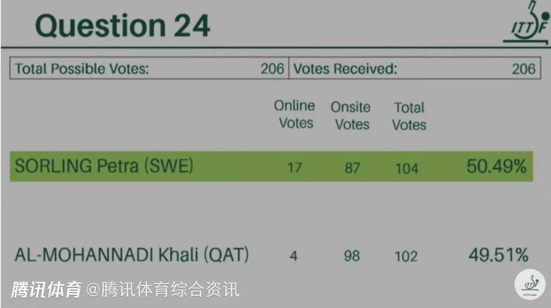 国际乒联大会进行到最为重要的主席竞选阶段时,现场投票结果显示,现任主席佩特拉-索林以2票微弱优势战胜另一位候选人、国际乒联高级执行副主席卡里尔-阿尔-默罕纳迪,然而卡塔尔方面对此结果提出质疑,因为现场点名网络投票的协会时是16个,投票结果网络投票的协会却是21个,卡塔尔官员要求投票透明和诚信,称会为此竭尽全力。