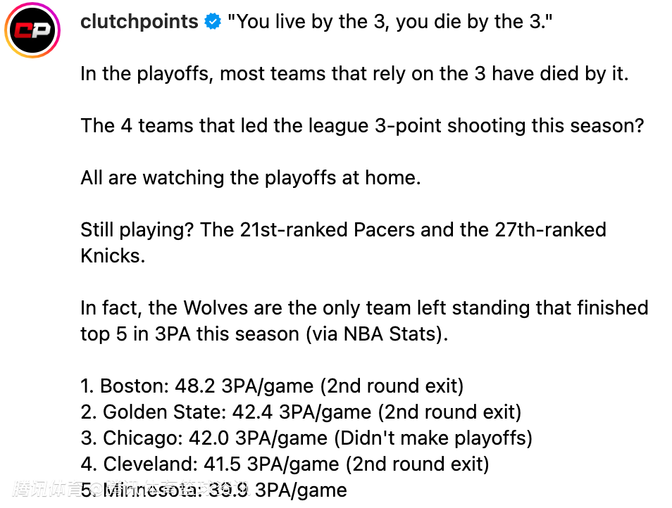 事实上,森林狼是唯一一支仍留在季后赛舞台、且本赛季三分出手数排名前五的球队,以下是具体数据: