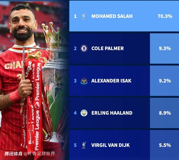 在投票中,萨拉赫获得70.3%的支持率,帕尔默得票率9.3%排在第2,伊萨克得票率9.2%排在第3,哈兰德得票率8.9%位列第4,范戴克得票率5.5%排在第5。