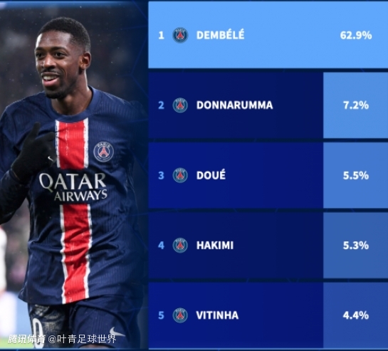 本赛季的登贝莱,打出金球级的表现,法甲29场21球8助,欧冠14场独造12球,是巴黎法甲夺冠、欧冠进决赛的头号功臣。登贝莱得票率62.9%遥遥领先,多纳鲁马7.2%排在第2位。