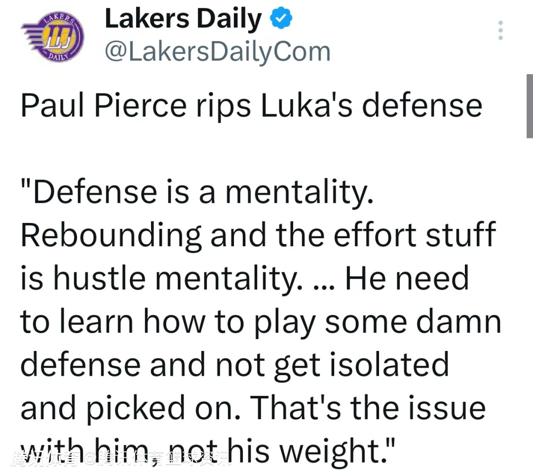 当被问及湖人球迷是否该为看到瘦身的东契奇而兴奋时,皮尔斯回应道:“我不知道,这家伙场均30分,场均三双,而你们却在谈论他的体重。我们该聊聊他在防守端的心态,因为我认为这才是问题所在。”