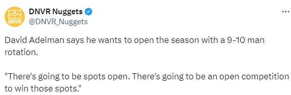 阿德尔曼透露希望新赛季采用9到10人的轮换阵容:“阵容名额将保持竞争机制,每个位置都需要通过竞争赢得上场机会。” 谈到球队需要补充的特质时,阿德尔曼指出:“稳定的投射能力。 这不仅是命中投篮,更是在关键时刻命中投篮,以及如何让自己为关键时刻做好准备。” 阿德尔曼还表示:“大家看到的球员之间的沟通默契,下赛季会继续延续。这是属于他们的球队,执教掘金是我的荣幸。”