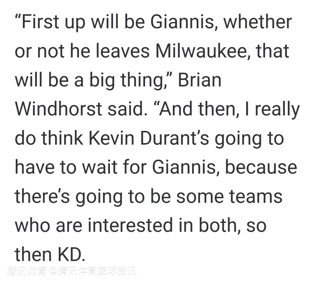 “首先是字母哥是否离开密尔沃基,这将是重中之重。其次,我认为杜兰特的交易可能会等待字母哥的动向,因为有些球队可能同时对两人感兴趣。”