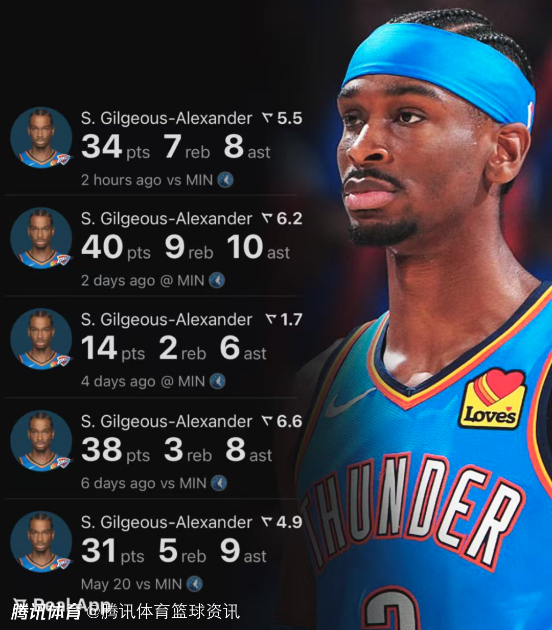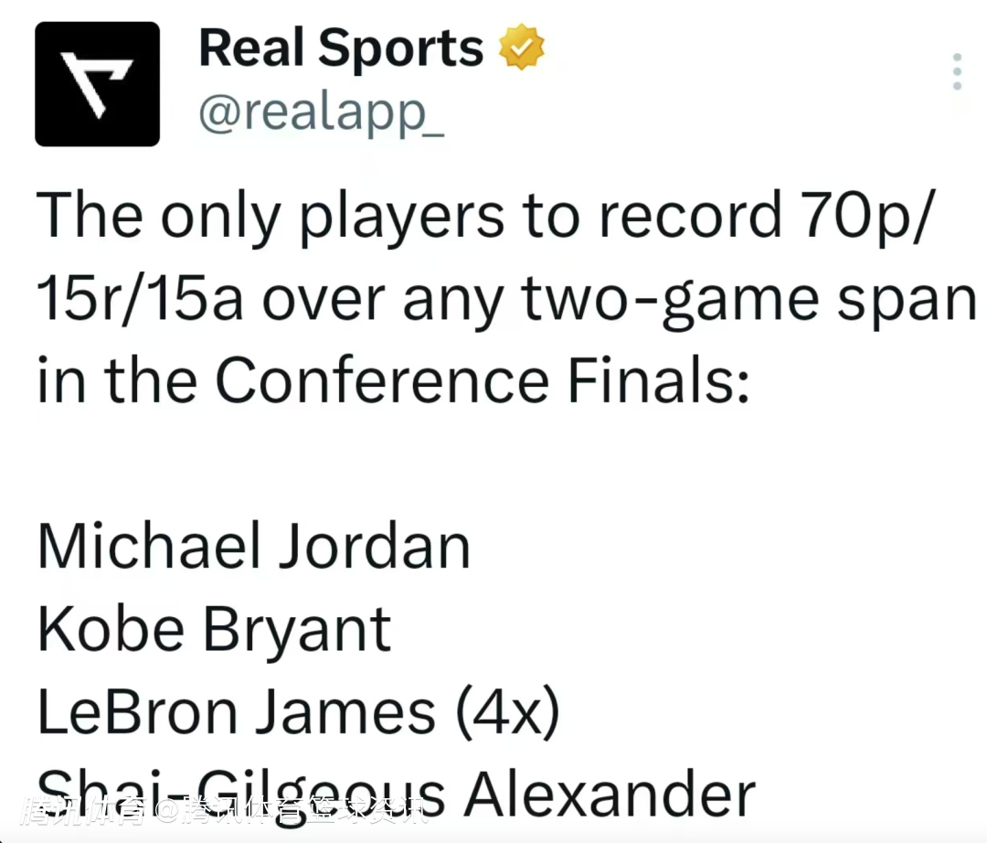 根据数据统计显示,加上上场比赛40分9篮板10助攻的表现,亚历山大成为在分区决赛的任意两场比赛中,能打出70分+15篮板+15助攻数据的球员之一,其他三位分别是乔丹、科比和詹姆斯(4次)。