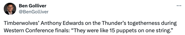 在评价雷霆在西部决赛中的团队协作时,爱德华兹说道:“他们就像同一根线上的15个木偶(意指配合默契、行动统一)。”
