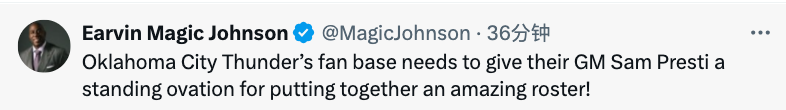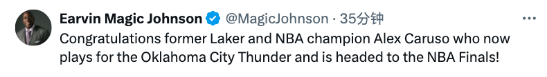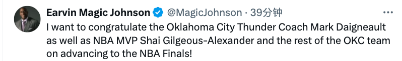 魔术师先行写道:“我要向雷霆主帅戴格诺特、NBA常规赛MVP亚历山大和全体雷霆队员致以祝贺,恭喜他们晋级NBA总决赛!”