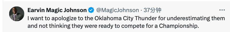 2025-05-29 12:30北京时间5月29日,NBA西决G5,雷霆以124-94大胜森林狼,总比分4-1淘汰对手,晋级总决赛。赛后魔术师约翰逊更推,向雷霆致歉。