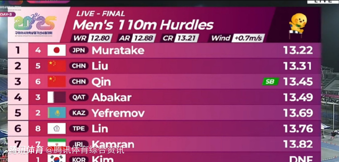 13秒31夺银!刘俊茜获亚锦赛男子110米栏亚军 队友秦伟搏摘铜