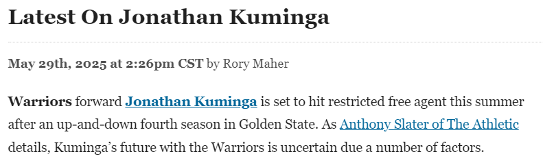 2025-05-30 05:40北京时间5月30日,库明加在勇士度过了起伏不定的第四个赛季后,将于今年夏天成为受限制自由球员。正如队记斯莱特所详述的那样,由于多种因素,库明加在勇士队的未来充满不确定性。