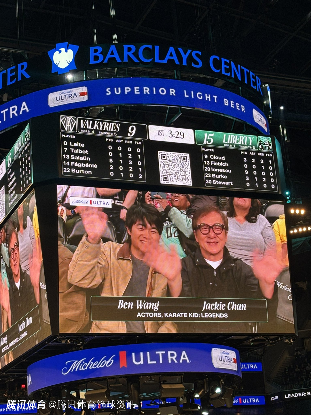 成龙来到现场观战WNBA,自由人主场的大屏幕也向现场球迷介绍了成龙的到来。坐在成龙身边的是美国演员王班。