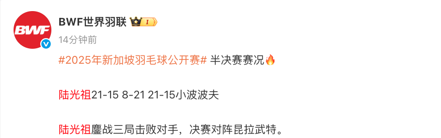 2025-05-31 21:40北京时间5月31日,北京时间5月31日,2025年新加坡羽毛球公开赛半决赛,陆光祖2-1(21-15、8-21、21-15)击败小波波夫,将和泰国选手昆拉武特会师男单决赛。