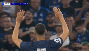 维蒂尼亚送出直塞,杜埃无私横传,阿什拉夫推射,攻破索默把守的大门,巴黎1-0领先!