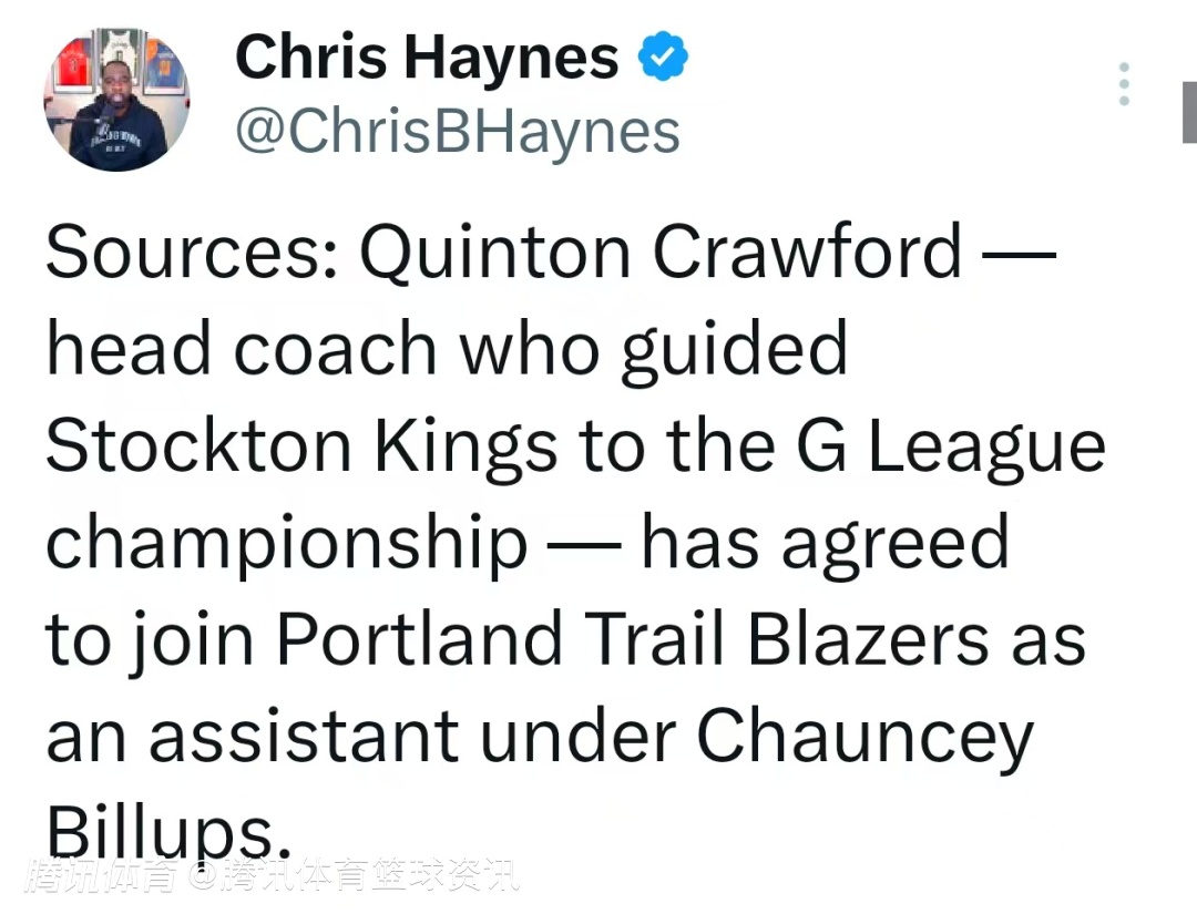 2025-06-01 10:20北京时间6月1日,根据名记Chris Haynes发布的消息显示,曾带领斯托克顿国王队夺得G联盟冠军的主教练昆顿-克劳福德已同意加盟开拓者队,担任主帅比卢普斯手下的助理教练。