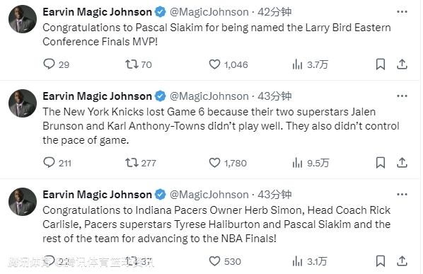 约翰逊写道:“祝贺印第安纳步行者队老板赫伯-西蒙、主教练里克-卡莱尔、步行者超级明星泰瑞斯-哈利伯顿和帕斯卡尔-西亚卡姆以及球队其他成员晋级NBA总决赛!祝贺帕斯卡尔-西亚卡姆当拿到拉里-伯德杯,当选东部决赛最有价值球员。”