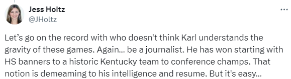 Jess Holtz写道:“让我们明确记录一下:那些认为唐斯不明白这些比赛重要性的人听好了。再说一遍……做个真正的记者吧。从高中夺冠到加入历史性的肯塔基大学球队,再到拿下分区冠军,唐斯一路赢过来。这种说法是对他的智慧和履历的贬低,但这种话总是很容易被说出口……”