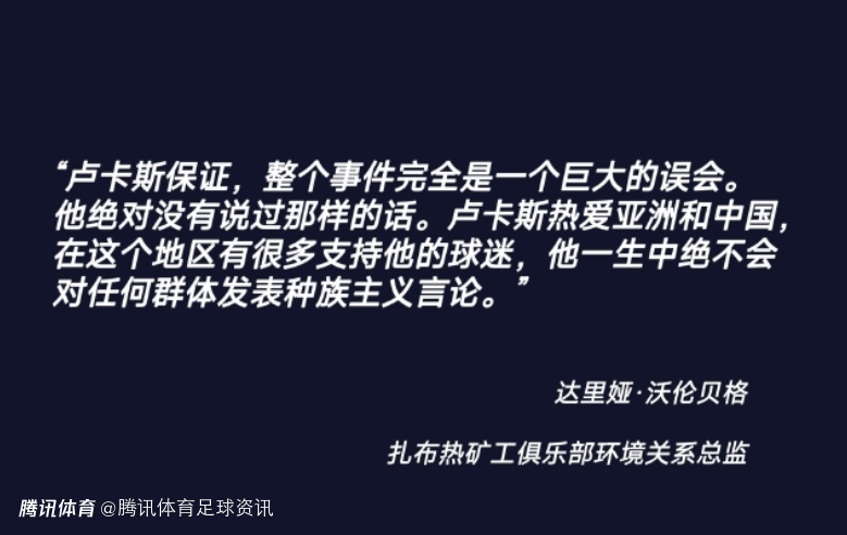 扎布热矿工官方表示:“卢卡斯保证,整个事件完全是一个巨大的误会。他绝对没有说过那样的话。卢卡斯热爱亚洲和中国,在这个地区有很多支持他的球迷,他一生中绝不会对任何群体发表种族主义言论。”