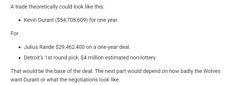 该记者设想的基础交易框架为兰德尔和自己手中活塞队的首轮签(今年17顺位),但需要注意的是,杜兰特最后一年的薪水约为5471万美元,兰德尔若执行球员选项,最后1年的薪水则约为2946万美元。如果森林狼队不同时续约里德和亚历山大-沃克,他们的总薪资将低于第二土豪线,使他们能够在交易中接收超出自身薪资 25% 的球员薪资。可即便如此,兰德尔加上首轮签选中球员的工资,仍然与杜兰特的薪水有一定差距,所以森林狼队还需要增加添头。