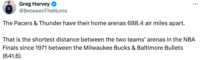 2025-06-02 09:30北京时间6月2日,东部决赛,步行者以总比分4-2淘汰尼克斯,和雷霆会师总决赛舞台。据美记格雷格-哈维报道,步行者队与雷霆队的主场球馆相距1107公里(直线距离)。这是自1971年密尔沃基雄鹿队与巴尔的摩子弹队(1032公里)以来,NBA 总决赛参赛双方球馆间距最短的一次。