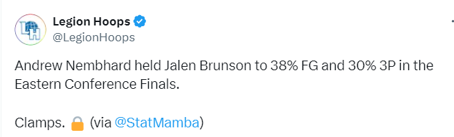 根据统计显示,当内姆布哈德对位布伦森的时候,后者的投篮命中率只有38%,三分球命中率只有30%。在东部决赛第6场比赛中,内姆布哈德送出6次抢断,刷新了分区决赛终结战的抢断数纪录。