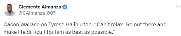 华莱士表示:“他们所有人都能得分,所有人都能防守。这是一支全面的优秀球队,他们赢下的比赛和我们一样多。”在谈到对于哈利伯顿的防守时,华莱士表示:“不能有任何放松,上场后要尽可能让他打得难受。”