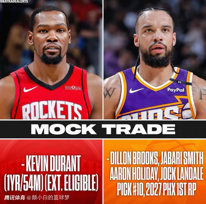 第一步交易,太阳得到:狄龙-布鲁克斯、小贾巴里-史密斯、阿龙-霍勒迪、乔克-兰代尔、2025年10号签、太阳2027年首轮签;