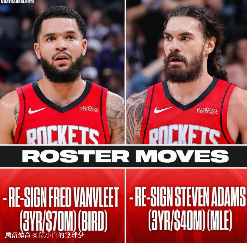 第二笔续约火箭队最重要的两个轮换,拒绝执行范弗利特下赛季4400万的球队选项,与他续约一份三年7000万的新合同,均薪为2333万,这符合如今范乔丹的身价,他本就不该是拿顶薪的一号位。