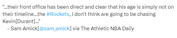 对于杜兰特可能加盟火箭的传闻,名记Sam Amick报道,考虑到杜兰特的年龄和时间线,这并不合适。我敢肯定地说,他不是火箭管理层考虑的方向,火箭不会追求杜兰特了。德文-布克也曾是他们的首选之一,但经过一个糟糕的赛季后,他可能已经不再是首选了。