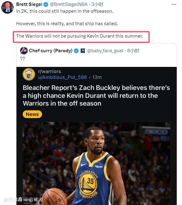 今夏杜兰特去哪儿将备受关注,有人表示杜兰特很可能重返勇士,不过ClutchPoints记者Brett Siege表示:2K游戏里,这种情况或许还能发生;但现实中,那艘船已经开走了;勇士今年夏天不会追求凯文-杜兰特。