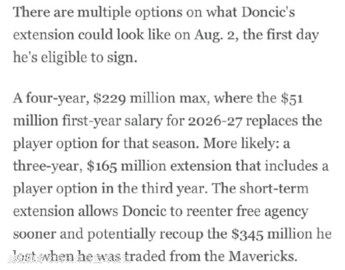 鲍比-马克斯写道:“关于东契奇在8月2日(他有资格签约的首日)可能达成的续约合同形式,目前有多种选择。一种是为期4年、价值2.29亿美元的顶薪合同,其中2026-27赛季5100万美元的首年薪资将取代该赛季的球员选项。更有可能的情况,是东契奇签下一份3年1.65亿美元的续约合同,其中包含第三年的球员选项。这份短期续约合同能让东契奇更快重新进入自由球员市场,并有可能弥补他从独行侠队被交易时损失掉的3.45亿美元超顶薪合同。”