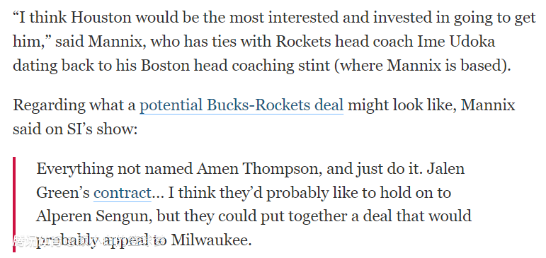 克里斯-曼尼克斯写道:“我认识休斯顿火箭队会对扬尼斯感兴趣并且愿意去报价争取。除了阿门-汤普森之外都可能沦为交易筹码,杰伦-格林的合同是一个重要筹码,我认为火箭希望留下阿尔佩伦-申京,火箭队可能会根据密尔沃基的需求制定一套具有吸引力的交易方案。”