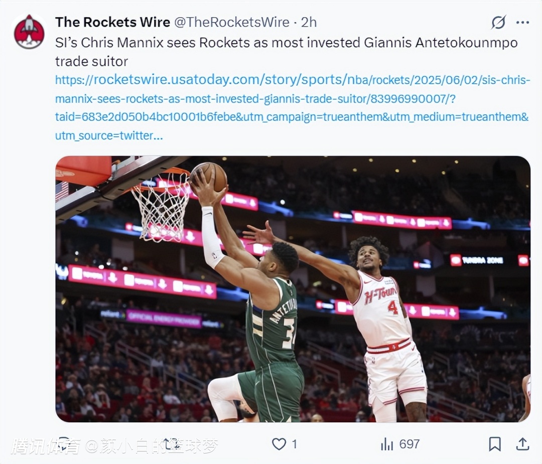 稍晚一点,《体育画报》记者克里斯-曼尼克斯透露,休斯顿火箭队愿意在今夏追求扬尼斯-阿德托昆博,这也是火箭队内部认为最契合球队的球星,休斯顿愿意进行报价。