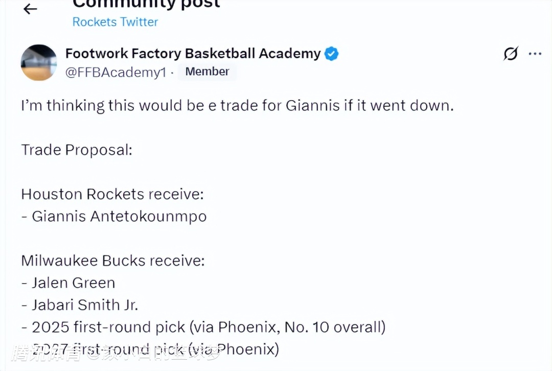 那么按照 克里斯-曼尼克斯的说法,最符合火箭预期的交易方案就出炉了,美媒FFBA模拟的这套方案——火箭送出杰伦-格林、小贾巴里-史密斯、2025年10号签、2027年太阳不保护首轮换扬尼斯。