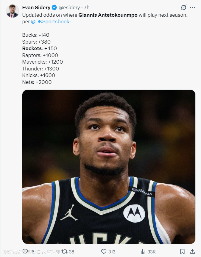 2025-06-03 12:10北京时间6月3日,DKS更新了扬尼斯-阿德托昆博的下家赔率:雄鹿-140、马刺+380、火箭+450、猛龙+1000。猛龙这支球队异军突起升至第四,因为近期ESPN透露乌杰里希望在今夏收获一条“大鱼”,很多人猜测是字母哥或杜兰特。
