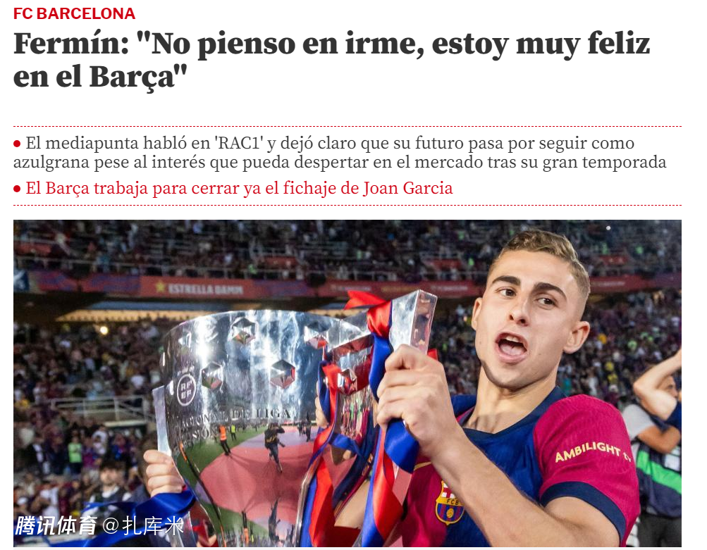 2025-06-03 12:10巴萨中场费尔明在接受RAC1 电台采访时明确表示,希望留在巴萨,同时表示,希望下赛季巴萨的成绩能够实现对上赛季的超越。