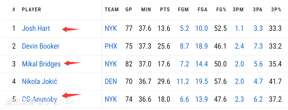 这在2024-25赛季是一个主要话题,尤其是像布里奇斯、哈特等球员的上场时间。数据说明了一切:哈特本赛季以场均37.6分钟的上场时间领跑全联盟,布里奇斯以37.0分钟排名第三,阿奴诺比以场均36.6分钟排名第五。这意味着尼克斯队有三名球员在NBA场均上场时间排名前五——这是一个令人难以置信且多少有些令人担忧的数据。