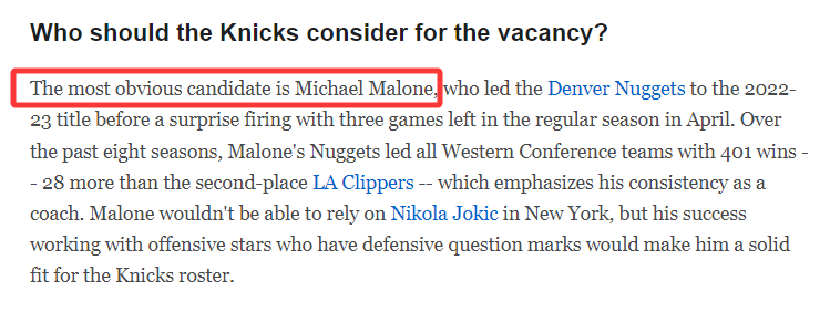 ESPN指出,马龙曾带领掘金在2022-2023赛季夺冠,但在今年4月常规赛还剩三场时被意外解雇。在过去8个赛季中,马龙执教的掘金队以401场胜利领跑西部联盟,比排名第二的快船多28场,这凸显了他作为教练的稳定性。马龙在纽约无法依靠约基奇,但他成功执教过有防守问题的进攻型球星,这使他很适合尼克斯的阵容。