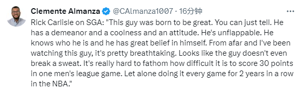 谈及亚历山大时,卡莱尔表示:“这家伙生来就注定伟大,你完全能感受到。他有种风范、冷静的态度和气质,处变不惊。他清楚自己是谁,对自我充满信心。从远处观察他,我一直觉得这很令人惊叹。他看起来甚至都不会流汗,很难想象在男子职业联赛中单场拿下30分有多难,更别说他在NBA连续两年每场都做到了。”