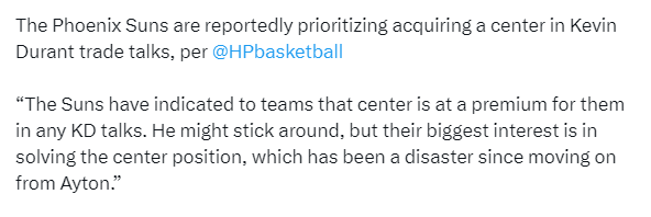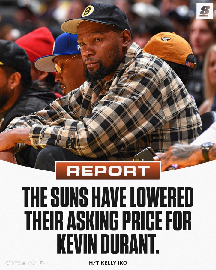 NBA记者Matt Moore报道,在所有关于杜兰特的交易谈判中,太阳会优先考虑换来得到一名中锋球员;该记者报道称:太阳已告知凯文-杜兰特的追求者,在任何有关的谈判中,得到中锋球员都是太阳更看重的事情。凯文-杜兰特有留下的可能,但太阳仍最希望解决球队的中锋问题,自从太阳交易走德安德烈-艾顿之后,中锋问题就成了球队的灾难。