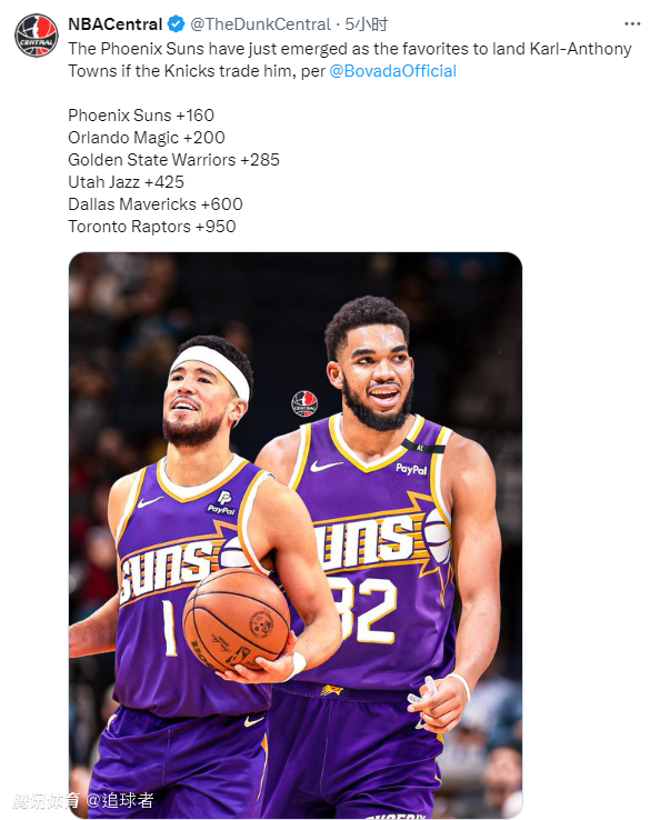 此前NBA记者Cris Davis报道,太阳想用杜兰特换来唐斯,他们对唐斯+布克的组合很感兴趣;尼克斯已经解雇了主教练锡伯杜,唐斯最新下家赔率出炉,太阳+160力压魔术和勇士排在第一位。