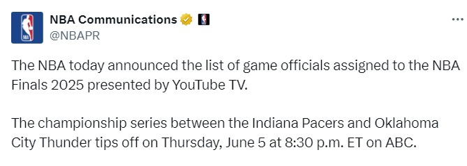 以下为2025年NBA总决赛执哨名单——