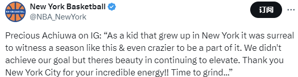 阿丘瓦写道:“作为一个在纽约长大的孩子,见证这样一个赛季实在是太梦幻了,而成为其中的一部分更是疯狂。我们没有实现目标,但在持续提升的过程中自有其美好之处。感谢纽约这座城市给予的惊人能量!是时候埋头苦干了……”