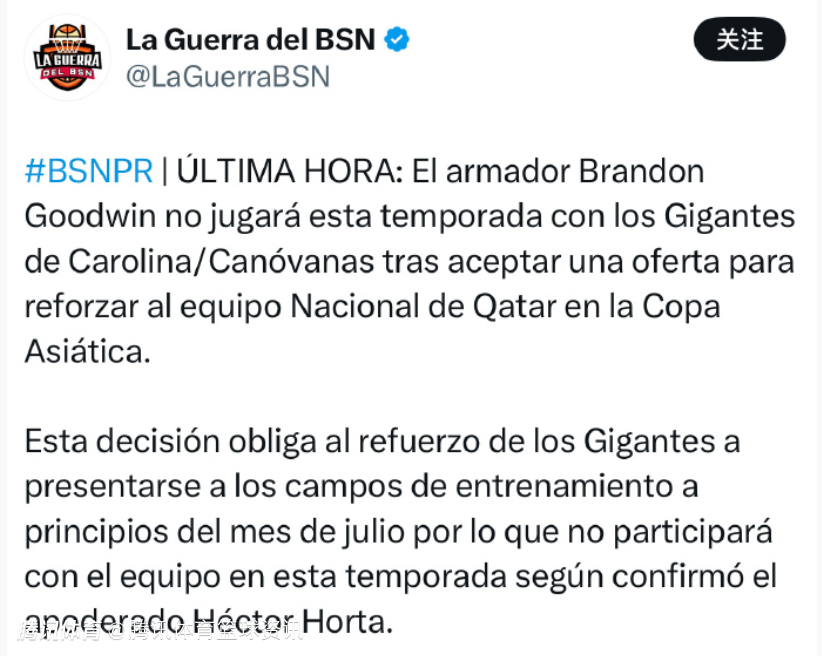 2025-06-05 01:00北京时间6月5日,据波多黎各媒体报道,CBA山西队外援布兰登-古德温接受卡塔尔男篮国家队的邀请,将代表卡塔尔男篮征战今年的男篮亚洲杯。