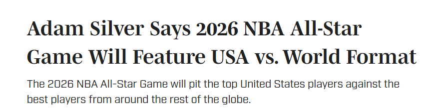 早在4月底,萧华就透露联盟会讨论美国队vs世界队的全明星赛制,而这次当被问及之前讨论的这个想法是否会在2026年实现时,萧华回答说:“是的。明年,作为我们新媒体协议的一部分,全明星赛将回到NBC电视台,我们年轻时它就在那里播出。而且碰巧的是,下个赛季正值冬奥会期间。”