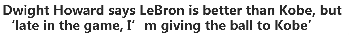 曾在NBA生涯不同阶段分别与两人做过队友的霍华德表示:"说实话,综合所有因素,你必须承认詹姆斯更出色。但论得分能力,我得说更喜欢科比。如果比赛最后时刻需要得分,我会把球交给他,而不是詹姆斯,关键球我一定给科比。"