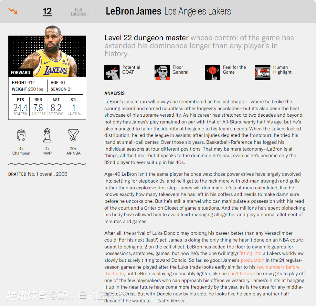 第12就是40岁高龄的勒布朗,本赛季场均24.4分7.8篮板8.2助攻1抢断0.6盖帽,命中率51.3%,三分命中率37.6%,大家也应该注意到上方那个箭头,他的排名比交易截止日那次排名下滑了。