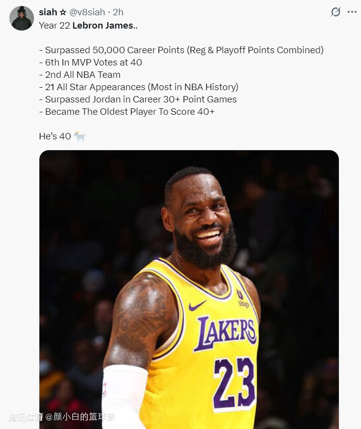 美媒晒出了勒布朗-詹姆斯40岁生涯第22个赛季的功绩:
