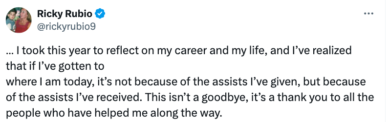 卢比奥在晒出照片的同时,也配文写道:“今年我花了些时间回顾自己的职业生涯与人生,渐渐明白走到今天,靠的从来不是我送出的助攻,而是那些曾给到我的助攻。这不是告别,而是想对所有在成长路上帮助过我的人说一声谢谢。”