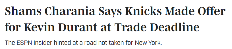 太阳队几乎肯定需要摆脱杜兰特下赛季5470万美元的薪资,以便为新帅乔丹-奥特的阵容改造腾出空间。杜兰特本人也希望为一支NBA总冠军竞争者效力,尼克斯队在赢下51场比赛并晋级东部决赛后,期待通过引援提升竞争力。