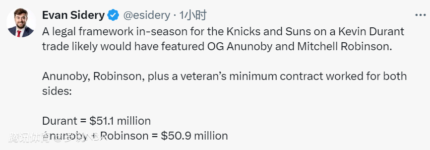 名记Sidery则分析出另一种交易可能。“尼克斯和太阳在赛季期间关于杜兰特交易制定的合理框架可能会包括阿奴诺比和米切尔-罗宾逊。两人再加上一份老将底薪,可以为双方配平这笔交易。杜兰特本赛季的薪水是5110万美元,阿奴诺比和米切尔-罗宾逊相加是5090万美元。”